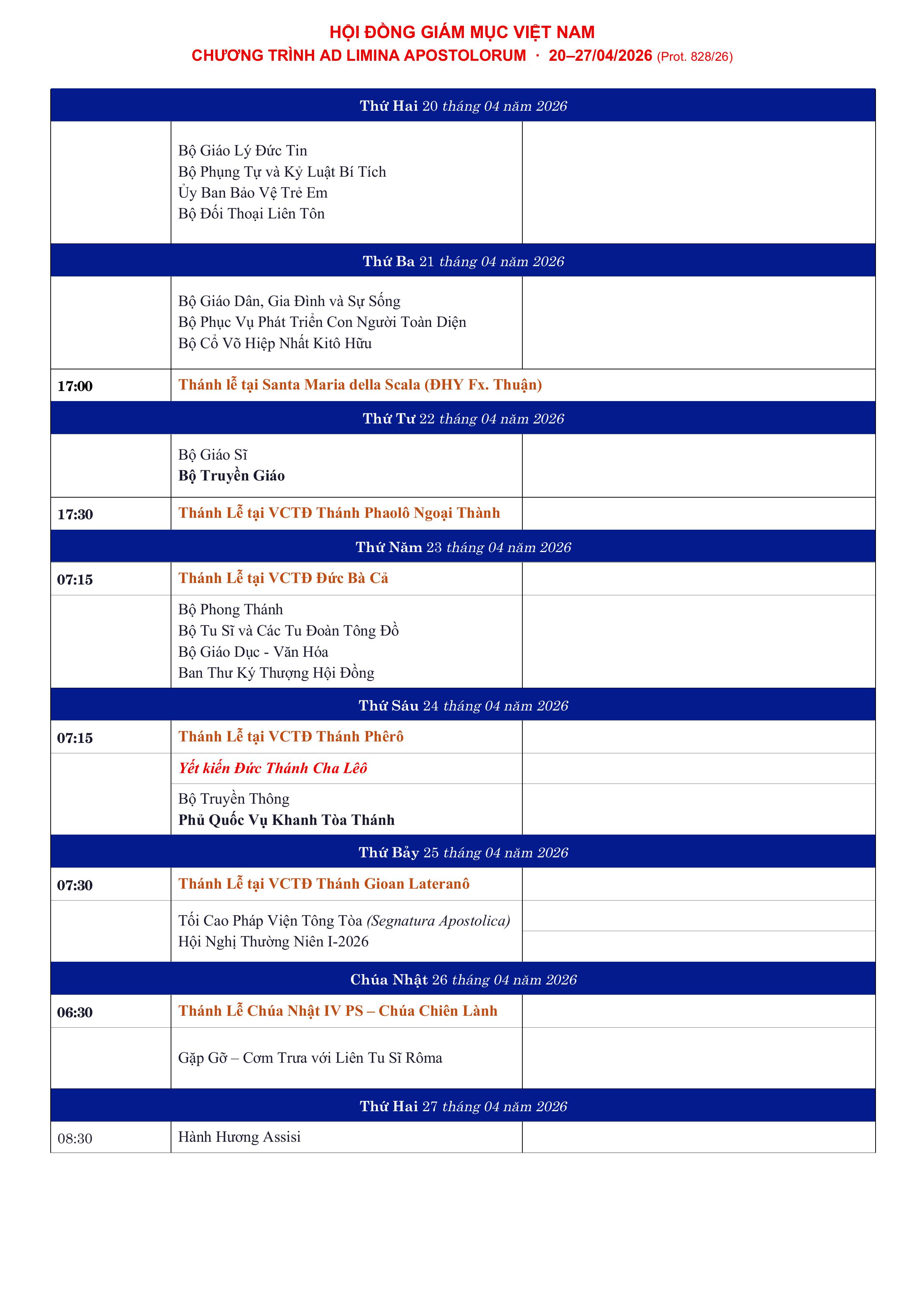 Trong thời gian ở Rôma, các Giám mục sẽ ở, sinh hoạt và hội họp tại Foyer Phát Diệm. Chương trình tuần Ad Limina năm nay diễn ra từ ngày 20 đến 27 tháng 4 năm 2026, với nhiều điểm nhấn quan trọng.