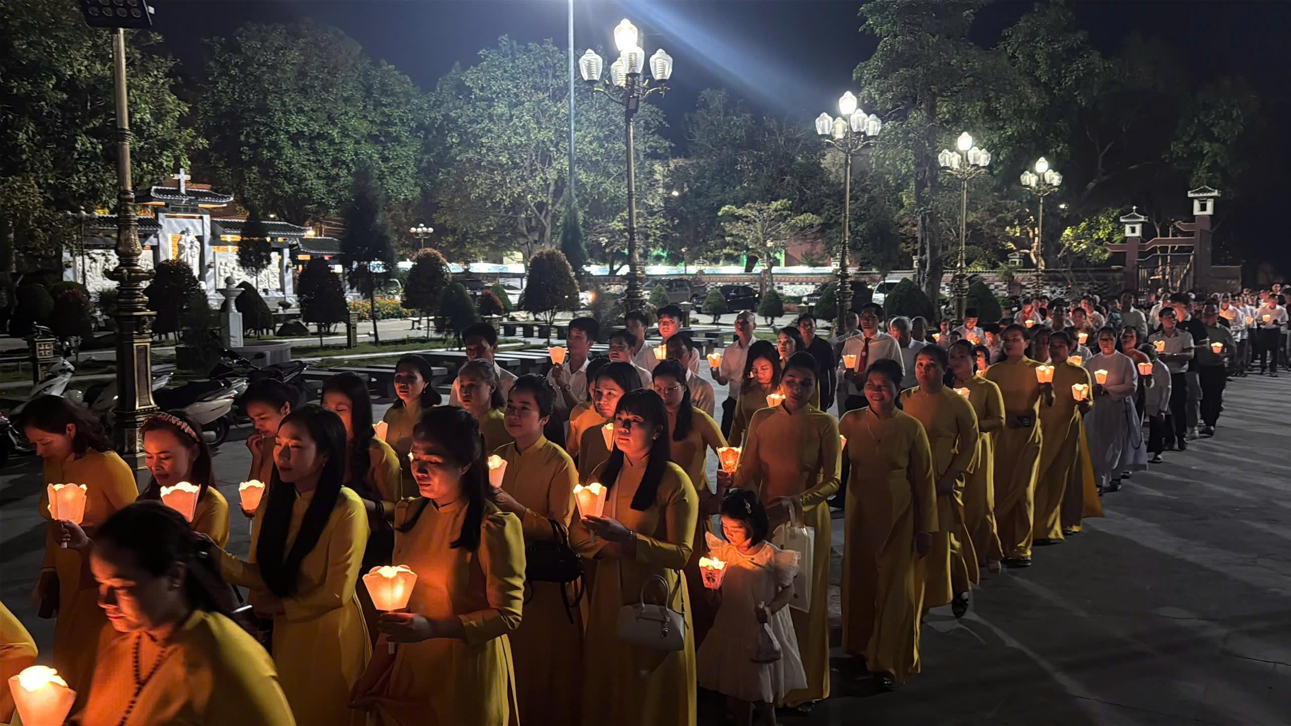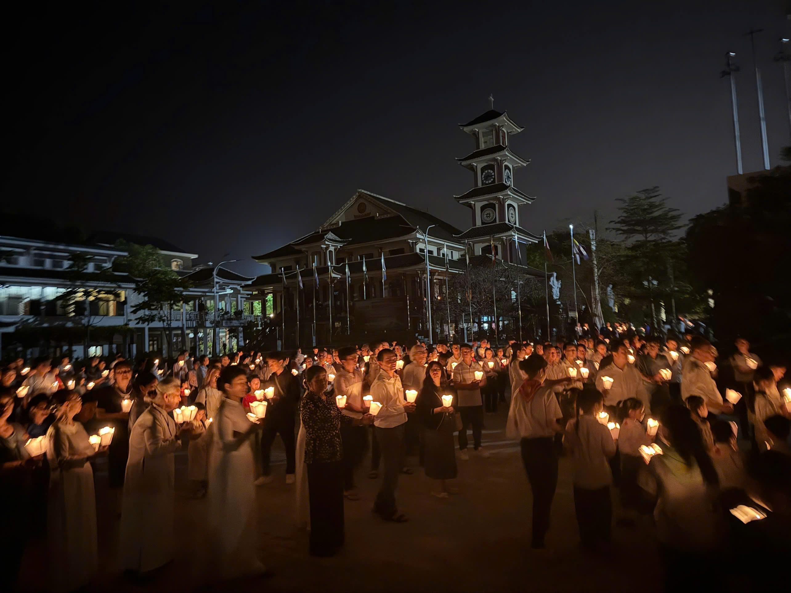 Bước vào giờ cử hành Đêm Canh thức, khuôn viên Tòa Giám mục và Nhà thờ Chính tòa chìm trong bóng tối và thinh lặng - một sự thinh lặng rất riêng của đêm thánh, như chờ đợi một điều gì đó đang sẵn sàng bừng lên. Từ tiền sảnh Nhà Truyền thống, Đức cha Giuse bắt đầu Nghi thức Làm phép lửa mới. Từ ngọn lửa ấy, cây nến Phục sinh được thắp sáng như dấu chỉ sự hiện diện của chính Đức Kitô Phục Sinh. Trong giây phút trang nghiêm, Cha Giuse Nguyễn Văn Đoàn long trọng công bố: “Ánh sáng Chúa Kitô!” như đánh thức cả không gian và lòng người. Ngọn lửa được trao truyền từ cây nến Phục sinh sang từng ngọn nến nhỏ trên tay cộng đoàn, để rồi tất cả cùng hợp thành một đoàn rước đông đảo, như dòng ánh sáng sống động, tiến vào Nhà thờ Chính tòa.