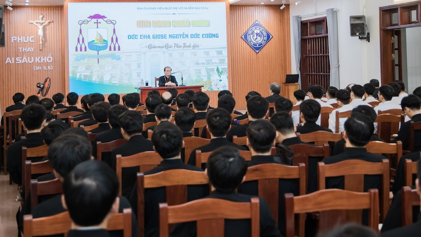 Sau phần chào mừng của quý thầy và giới thiệu của cha Giám đốc Đaminh, Đức cha Giuse ngỏ lời chào thân thương đến quý cha trong Ban Giám đốc, quý cha giáo và tất cả quý thầy đang tu học tại mái trường Chủng viện mang tên Mẹ. Mở đầu buổi chia sẻ, vị chủ chăn của giáo phận Thanh Hóa chia sẻ: “Chủng viện Bùi Chu như là lớp đàn anh của Chủng viện Thanh Hóa. Là anh vì hơn về năm thành lập. Là anh vì hơn về số lượng chủng sinh. Là anh vì hơn cả về Ban Đào tạo và cơ sở vật chất, và nhiều cái hơn khác nữa.”