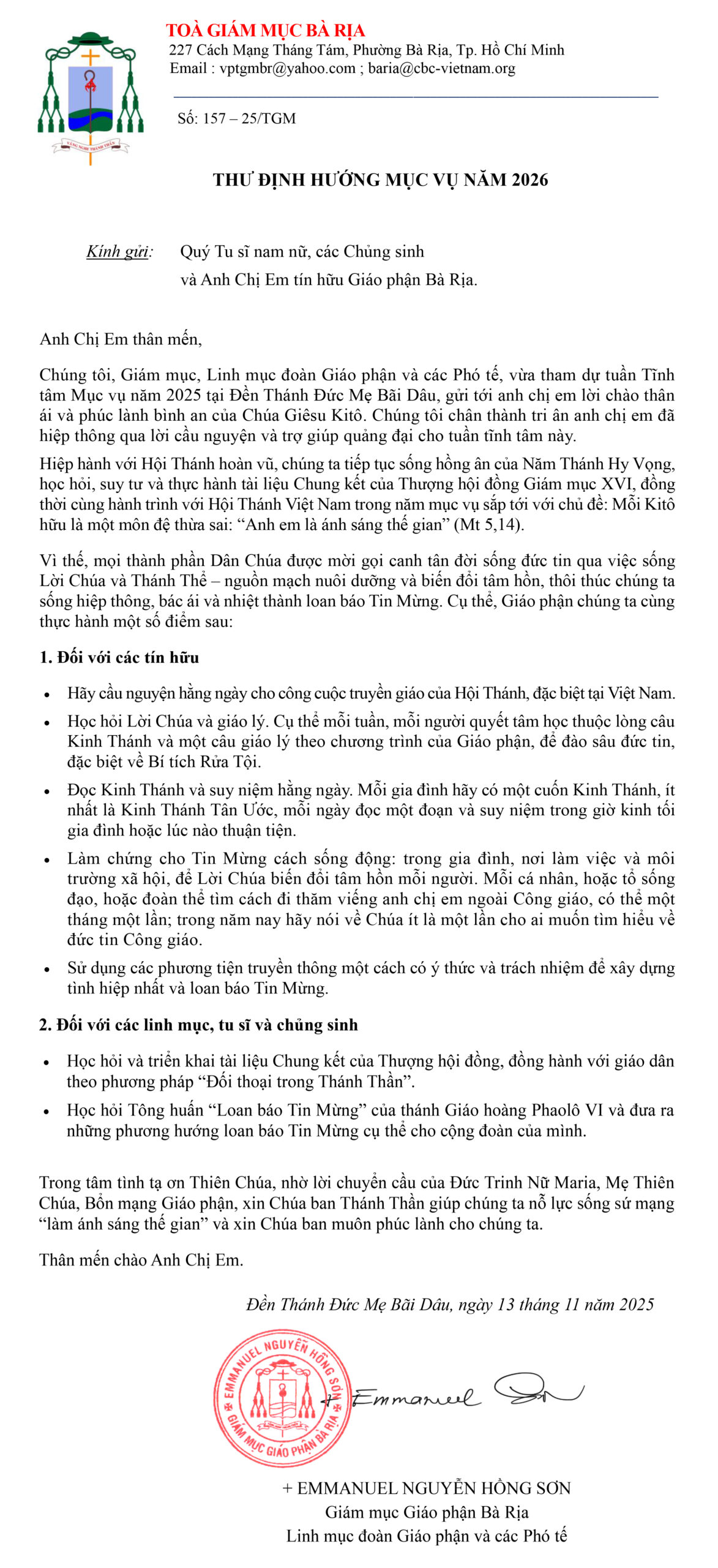 Hiệp hành với Hội Thánh hoàn vũ, chúng ta tiếp tục sống hồng ân của Năm Thánh Hy Vọng, học hỏi, suy tư và thực hành tài liệu Chung kết của Thượng Hội đồng Giám mục XVI, đồng thời cũng hành trình với Hội Thánh Việt Nam trong năm mục vụ sắp tới với chủ đề: Mỗi Kitô hữu là một môn đệ thừa sai: “Anh em là ánh sáng thế gian” (Mt 5,14).