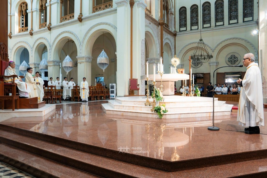 Ngài cho biết, bên cạnh ý nghĩa phụng vụ của ngày lễ, cộng đoàn còn hiệp dâng lời tạ ơn vì việc đưa hai Thánh giá lớn lên đỉnh tháp nhà thờ trong buổi sáng đã diễn ra thuận lợi. Dù công trình trùng tu vẫn còn tiếp tục, việc hoàn tất hạng mục này là một dấu mốc cụ thể đối với Nhà thờ Chính tòa Đức Bà Sài Gòn.