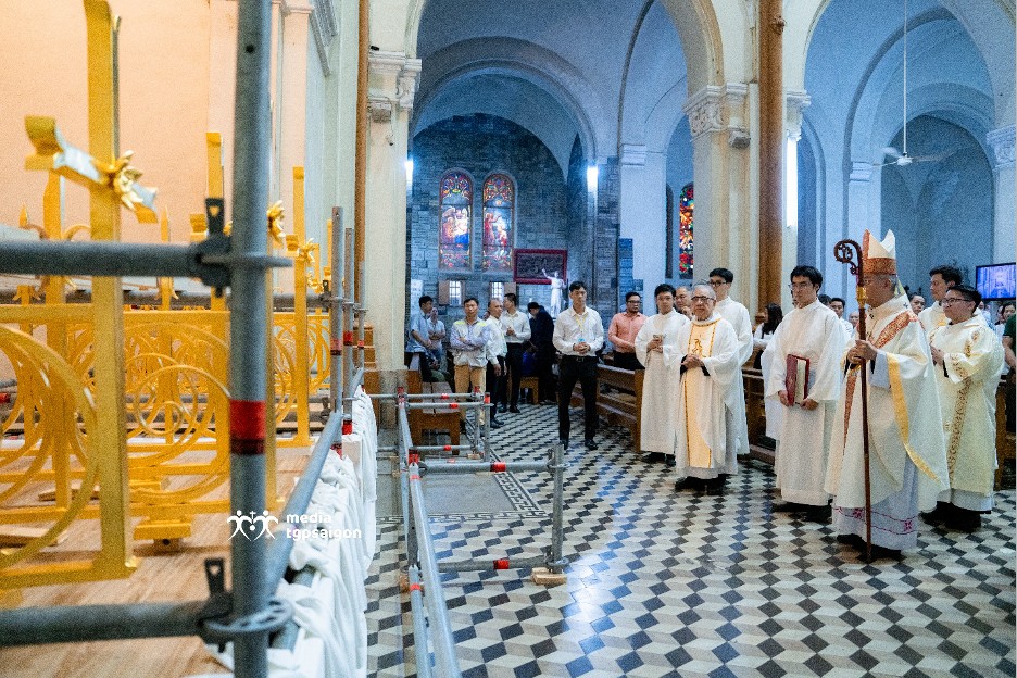 Sau lời nguyện xin Thiên Chúa chúc lành, Đức Tổng đã rảy nước thánh và xông hương các Thánh giá. Nghi thức diễn ra trong bầu khí trang nghiêm, gắn với tiến trình từng bước hoàn thiện các chi tiết kiến trúc của công trình trùng tu.