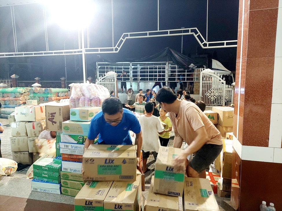 - Hàng trăm thùng mì, đường, sữa, nước suối, bánh, hạt nêm, xà bông, kem đánh răng