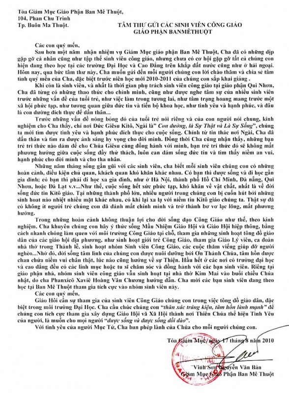 Sau hơn một năm nhận nhiệm vụ Giám Mục giáo phận Ban Mê Thuột, Cha đã có những dịp gặp gỡ cá nhân cũng như tập thể sinh viên công giáo, nhưng chưa có cơ hội gặp gỡ tất cả chúng con hiện đang theo học tại các trường Đại Học và Cao Đẳng trên khắp đất nước cũng như ở hải ngoại. Hôm nay, qua bức tâm thư này, Cha muốn gửi đến mỗi người chúng con lời chào thăm và chia sẻ tâm tình quý mến của Cha, đặc biệt trước niên học mới 2010-2011 của chúng con sắp khai giảng .